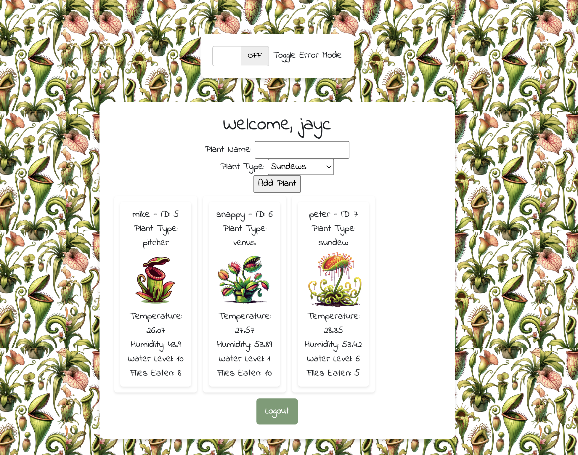 - Create a plant: Once logged in, give your plant a name, select a plant type and click Add Plant. Do this a few times if you like.